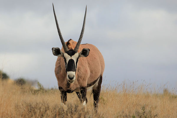 Gemsbok are light taupe to tan in color, with lighter patches toward the bottom rear of the rump. Their tails are long and black in color. A blackish stripe extends from the chin down the lower edge of the neck, through the juncture of the shoulder and leg along the lower flank of each side to the blackish section of the rear leg. They have muscular necks and shoulders, and their legs have white 'socks' with a black patch on the front of both the front legs, and both sexes have long, straight horns. Comparably, the East African oryx lacks a dark patch at the base of the tail, has less black on the legs (none on the hindlegs), and less black on the lower flanks. One very rare color morph is the "golden oryx", in which the gemsbok's black markings are muted and appear to be golden. Gemsbok are the largest species in the genus Oryx. They stand about 1.2 m (4 ft) at the shoulder. The body length can vary from 190 to 240 cm (75 to 94 in) and the tail measures 45 to 90 cm (18 to 35 in). Male gemsbok can weigh between 180 and 240 kg (400 and 530 lb), while females weigh 100–210 kg (220–460 lb).Gemsbok are widely hunted for their spectacular horns that average 85 cm (33 in) in length. From a distance, the only outward difference between males and females is their horns, and many hunters mistake females for males each year. In males horns tend to be thicker with larger bases. Females have slightly longer, thinner horns. Female gemsbok use their horns to defend themselves and their offspring from predators, while males primarily use their horns to defend their territories from other males. Gemsbok are one of the few antelope species where female trophies are sometimes more desirable than male ones. A gemsbok horn can be fashioned into a natural trumpet and, according to some authorities, can be used as a shofar